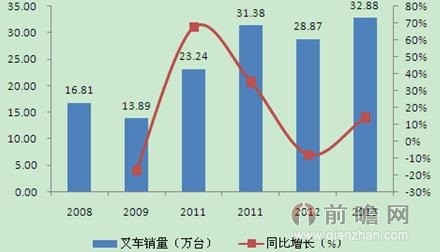 圖表2:2008-2013年中國(guó)機(jī)動(dòng)工業(yè)車輛銷量走勢(shì)圖(單位:萬(wàn)臺(tái),%)