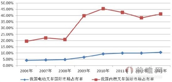 圖表3:2006-2013年我國(guó)內(nèi)燃叉車和電動(dòng)叉車的全球占有率情況(單位:%)